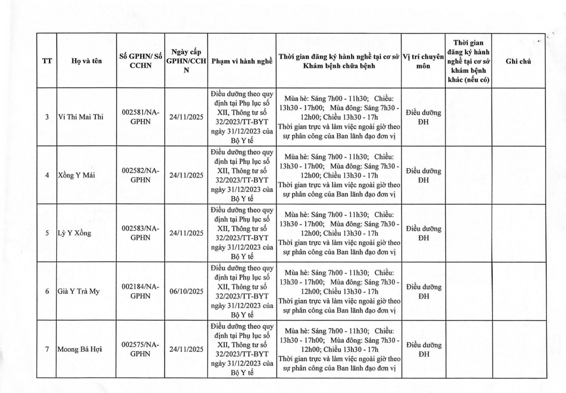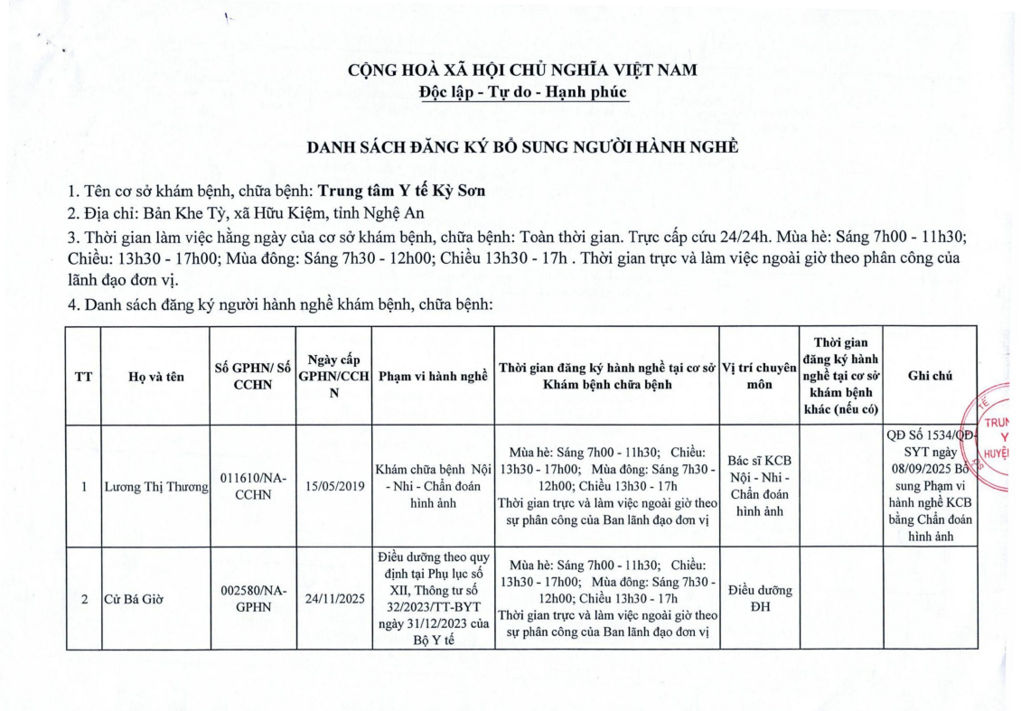 Danh sách đăng ký bổ sung người hành nghề (10/12/2025) tại trung tâm Y tế Kỳ Sơn