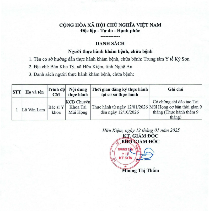 Danh sách người hành nghề Khám chữa bệnh (12/01/2026) tại trung tâm Y tế Kỳ Sơn
