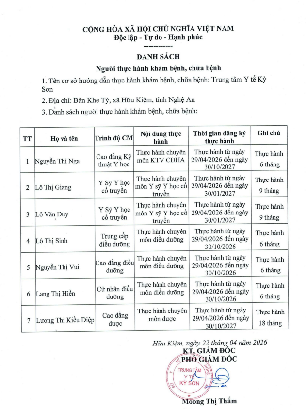 Danh sách người thực hành Khám chữa bệnh (22/04/2026) tại Trung tâm Y tế Kỳ Sơn