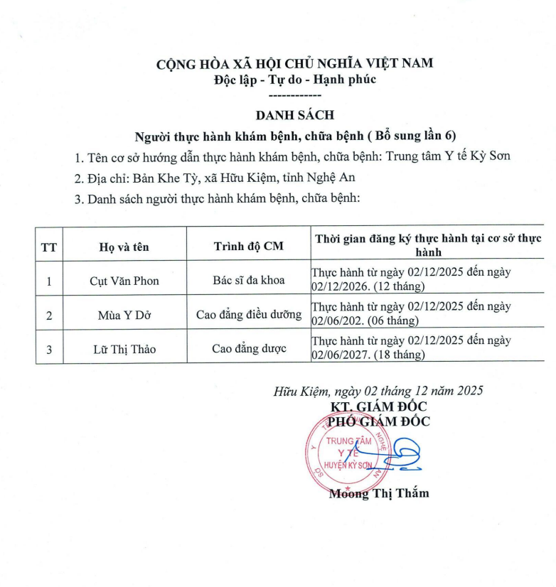 Danh sách thực hành khám bệnh, chữa bệnh năm 2025 tại TTYT Kỳ Sơn ( Bổ sung lần 6)