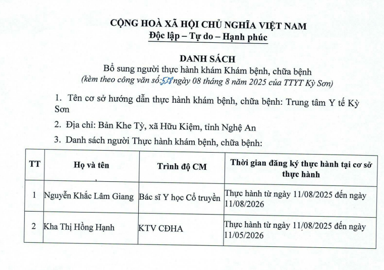 Danh sách bổ sung người thực hành khám bệnh chữa bệnh tại TTYT Kỳ Sơn năm 2025