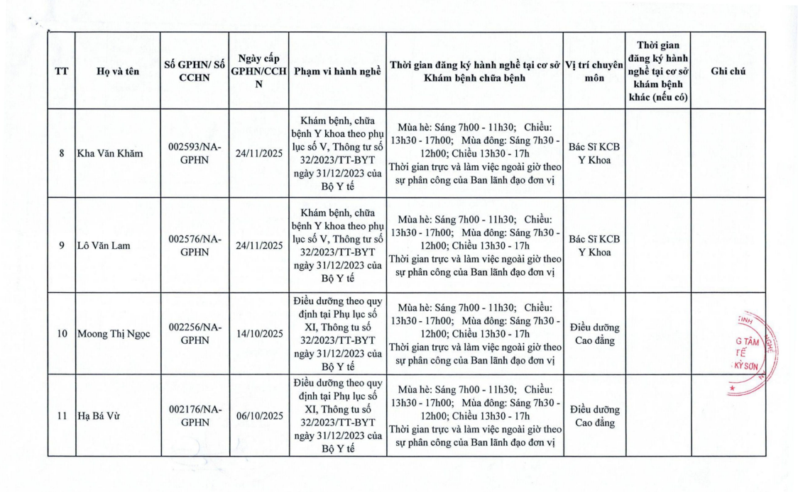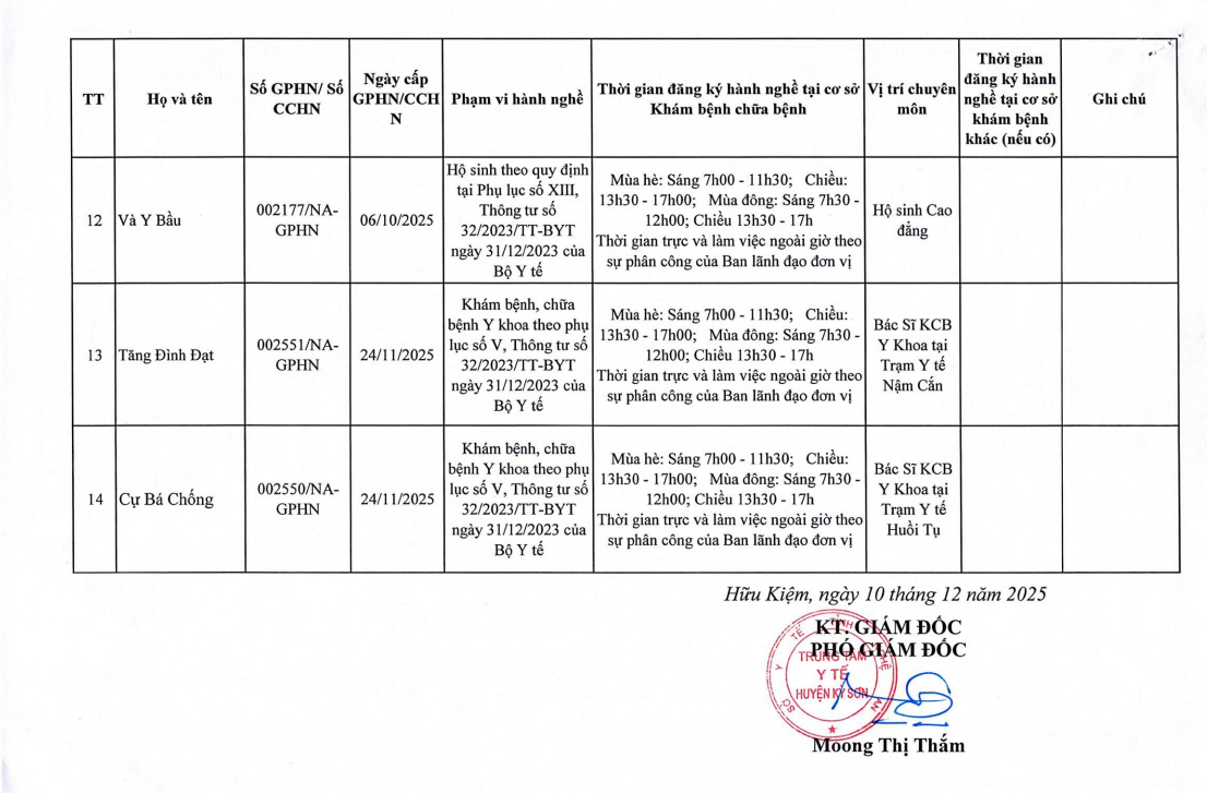 Danh sách đăng ký bổ sung người hành nghề (10/12/2025) tại trung tâm Y tế Kỳ Sơn