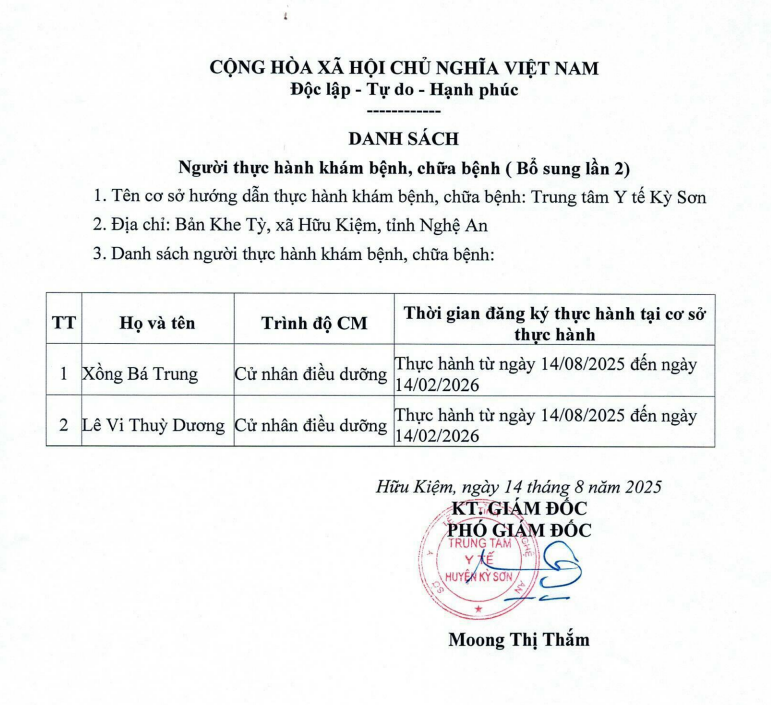Danh sách thực hành khám bệnh, chữa bệnh năm 2025 tại TTYT Kỳ Sơn (Bổ sung lần 2)
