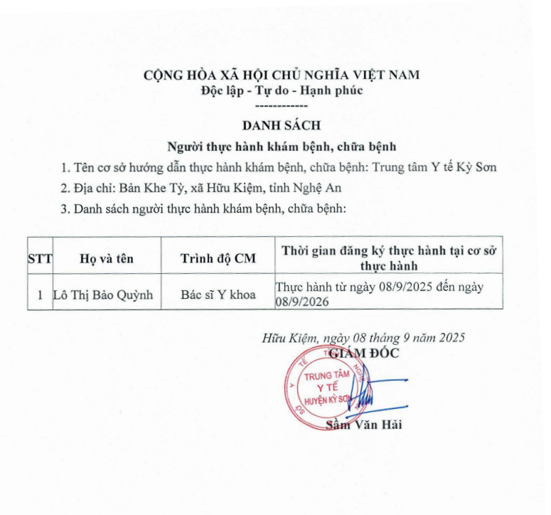 Danh sách thực hành khám bệnh, chữa bệnh năm 2025 tại TTYT Kỳ Sơn (Bổ sung lần 3)