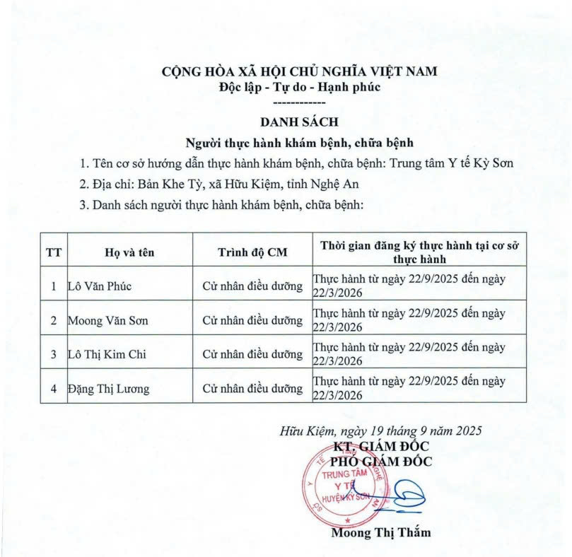 Danh sách thực hành khám bệnh, chữa bệnh năm 2025 tại TTYT Kỳ Sơn (Bổ sung lần 4)